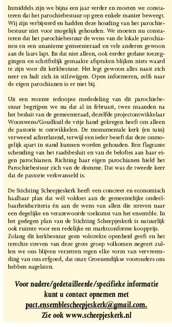 voor de onduidelijkheden over de mogelijke ontwikkelingen in de voormalige pastorie van de kerk.